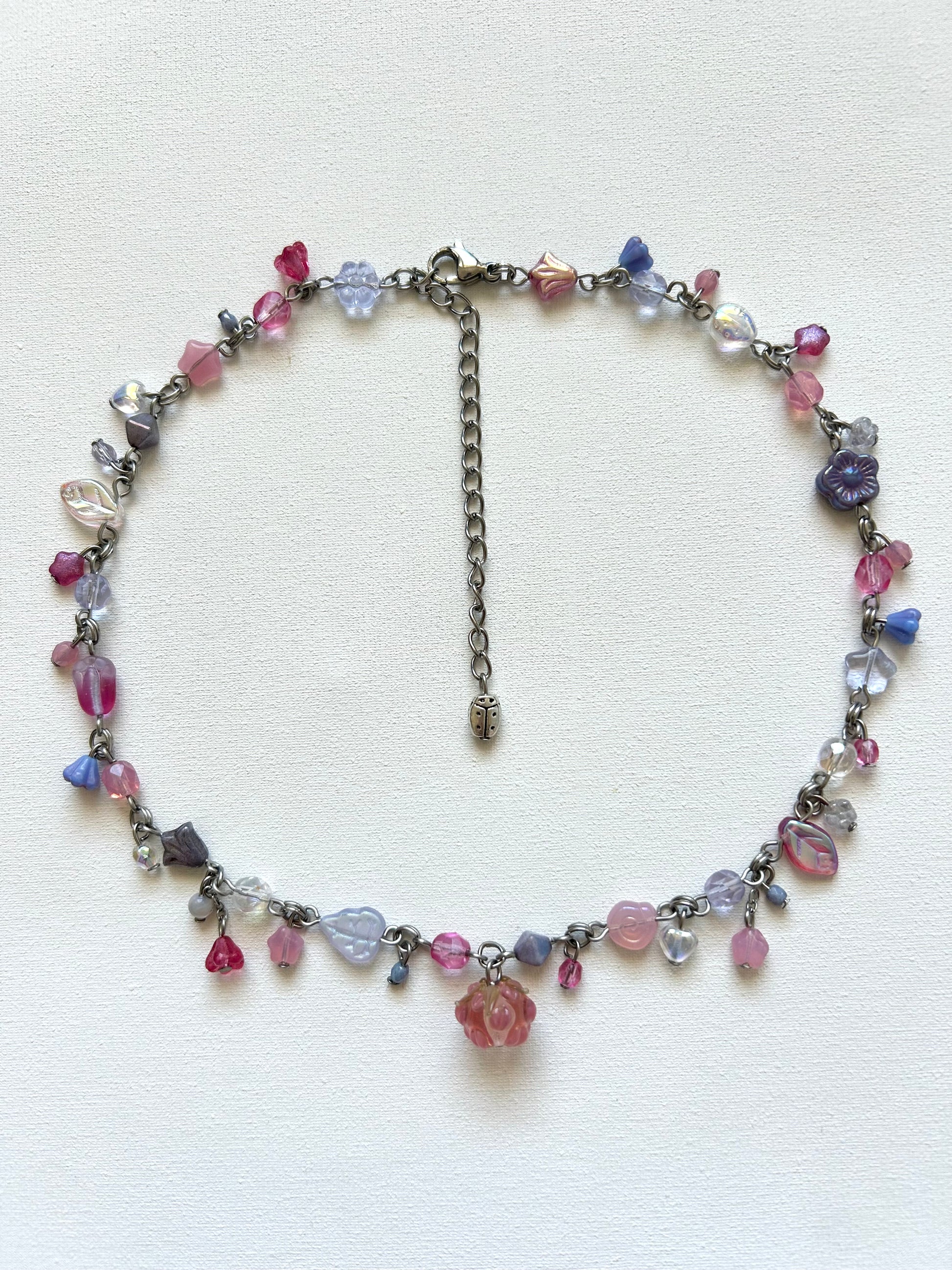 CARE- all of my pieces are made with love and stainless steel, designed to bring you a long lasting whimsical touch to everyday life. :) to insure longevity, remove jewelry before making contact with water, avoid spraying perfume directly on piece, take off before sleeping to avoid tugging and take off before exercising to avoid moisture. keep in a dry place, avoid keeping in humidity such as in a bathroom. all of my pieces contain glass beads therefore are fragile and should be handled with care.