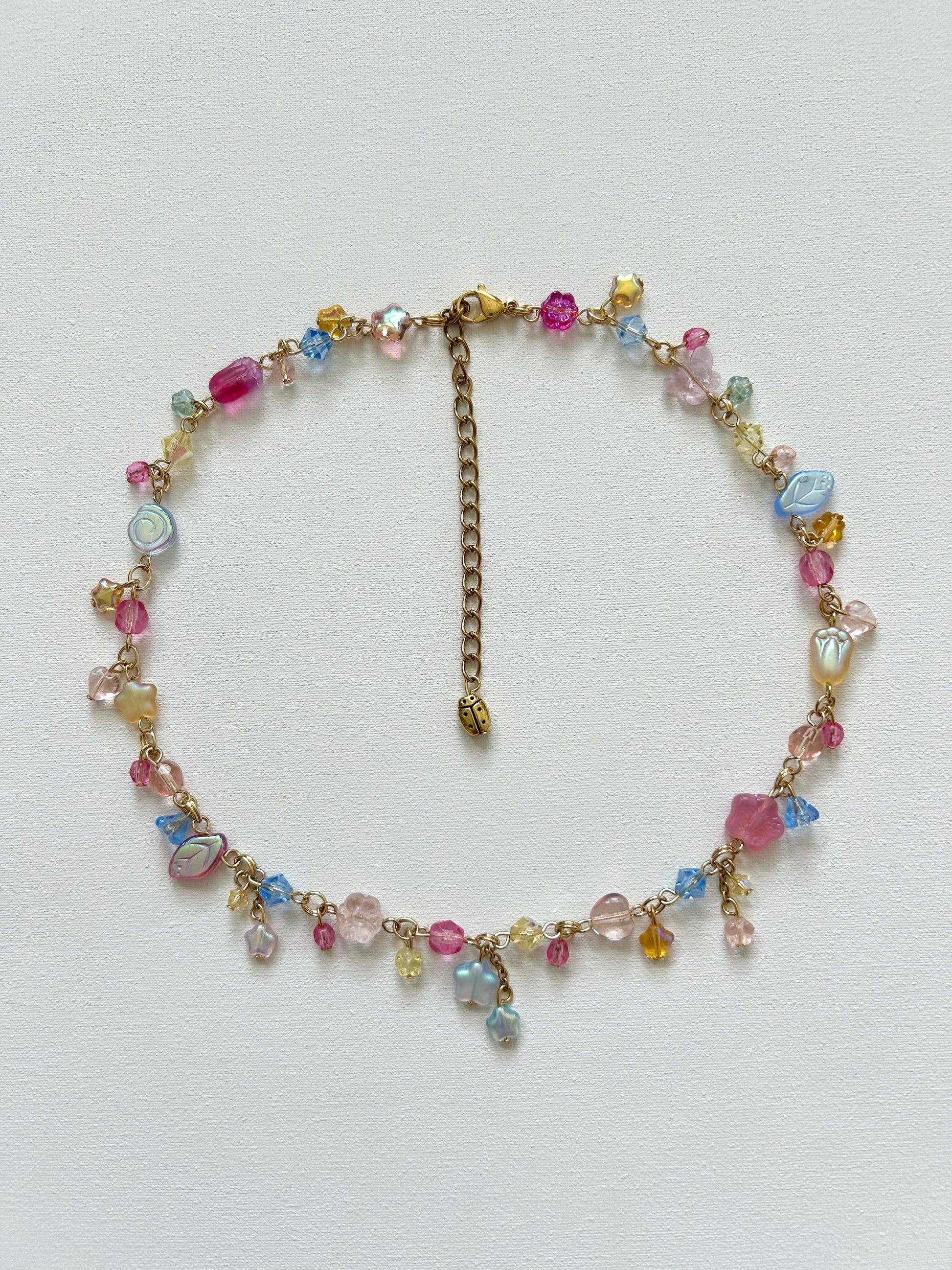 CARE- all of my pieces are made with love and stainless steel, designed to bring you a long lasting whimsical touch to everyday life. :) to insure longevity, remove jewelry before making contact with water, avoid spraying perfume directly on piece, take off before sleeping to avoid tugging and take off before exercising to avoid moisture. keep in a dry place, avoid keeping in humidity such as in a bathroom. all of my pieces contain glass beads therefore are fragile and should be handled with care.