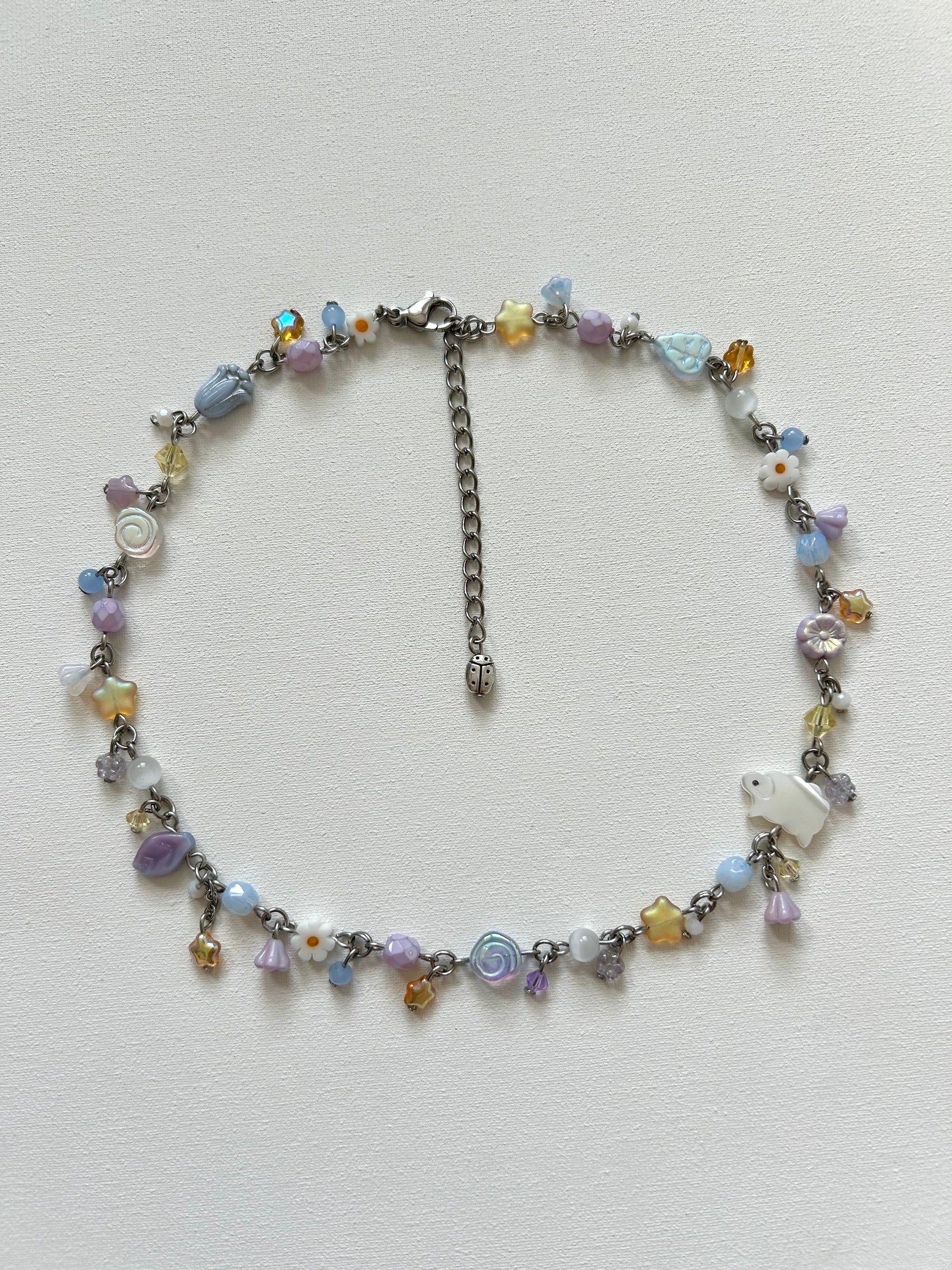 CARE- all of my pieces are made with love and stainless steel, designed to bring you a long lasting whimsical touch to everyday life. :) to insure longevity, remove jewelry before making contact with water, avoid spraying perfume directly on piece, take off before sleeping to avoid tugging and take off before exercising to avoid moisture. keep in a dry place, avoid keeping in humidity such as in a bathroom. all of my pieces contain glass beads therefore are fragile and should be handled with care.