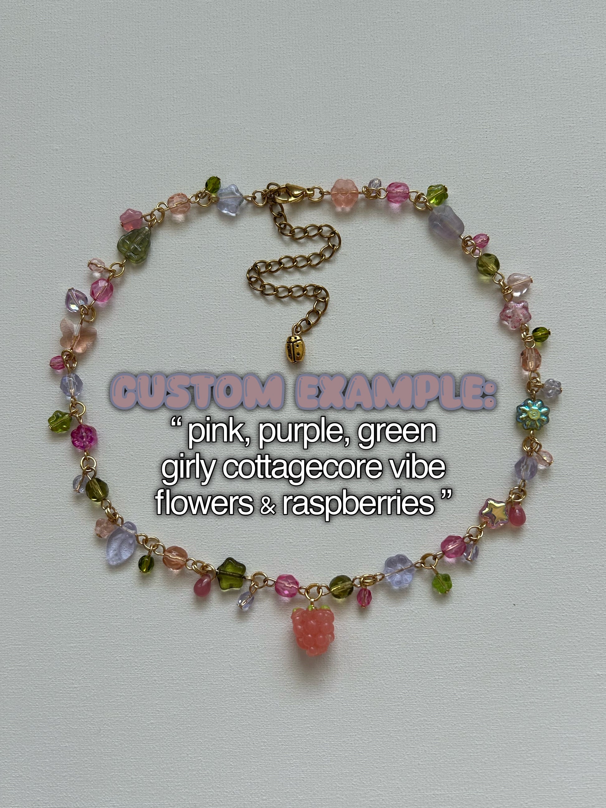 ABOUT- in “custom info” text box: list 2-4 colors and be specific to shades if preferred.(ex: LIGHT pink, MOSSY green). please also give a vibe/theme/inspo to go off of. this can be as simple as “forest fairy” or can be your favorite character from a movie/show, album or anything! you can also mention a past necklace of mine and i can make it as close as possible, but it will most likely not be 100% identical due to price adjustments and beads available. if there is something you absolutely do or don’t want as far as a charm, bead or color goes please mention that as well.